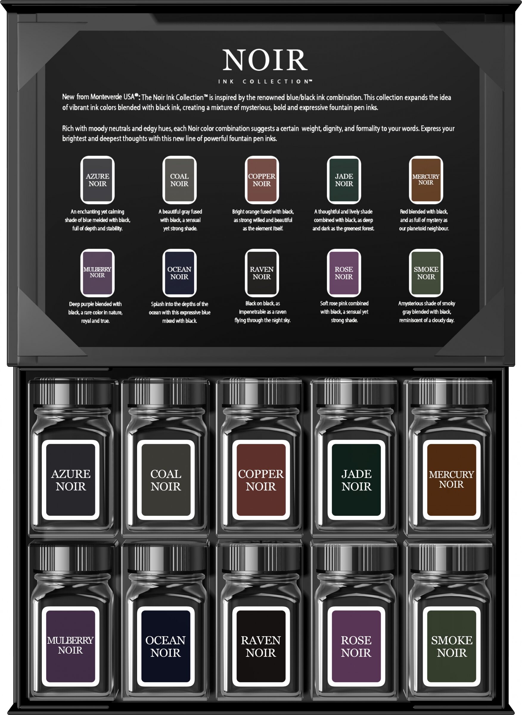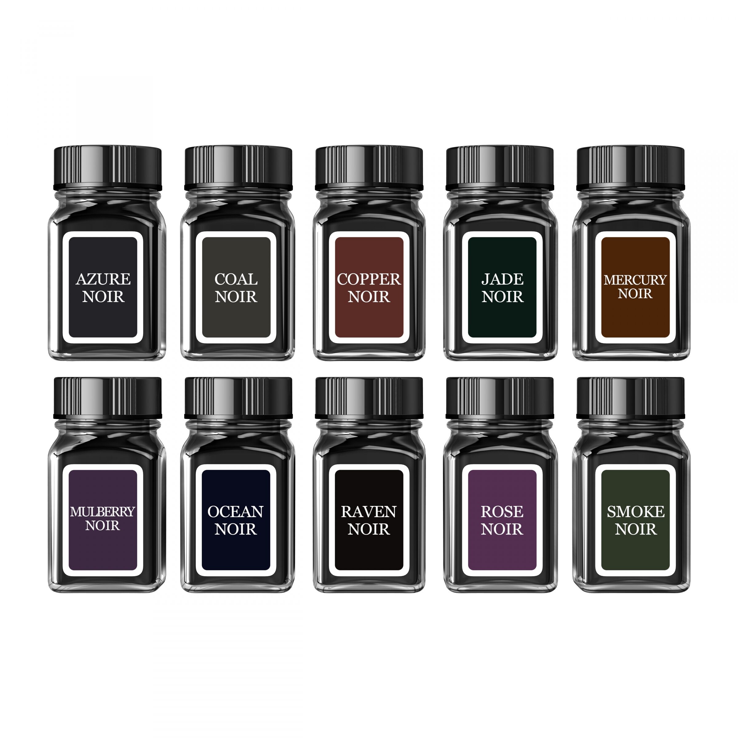 Set: Set 10 calimari Noir cu cerneala asortata permanenta cu uscare rapida pe baza de pigment 30ml
